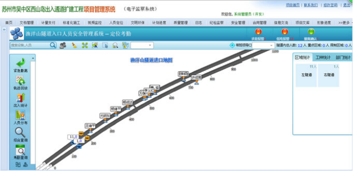 工地人員安全定位管理系統(tǒng),采用先進(jìn)的Zigbee無線技術(shù),結(jié)合公路隧道、鐵路隧道、電力隧道、城市地鐵安全生產(chǎn)企業(yè)的技術(shù)要求和安全標(biāo)準(zhǔn)進(jìn)行設(shè)計(jì)。該系統(tǒng)利用同一套通信網(wǎng)絡(luò),便可實(shí)現(xiàn)隧道人員定位、人員考勤、手機(jī)無線通訊、LED同步控制、視頻監(jiān)控、闖入報(bào)警、環(huán)境監(jiān)測等功能。獨(dú)特的多網(wǎng)合一系統(tǒng)不僅滿足隧道施工多方面的功能需求,并且具有顯著的“低成本、高效率”優(yōu)勢。通過給隧道人員佩帶定位卡,地面監(jiān)控人員可在隧道地圖實(shí)時(shí)觀測到所有隧道人員的真實(shí)分布情況,如數(shù)量、姓名等,通過分析人員的位置運(yùn)動(dòng)情況,從而可進(jìn)行人員考勤管理。