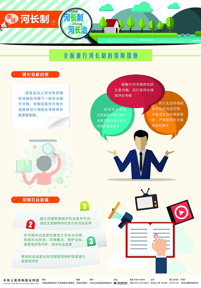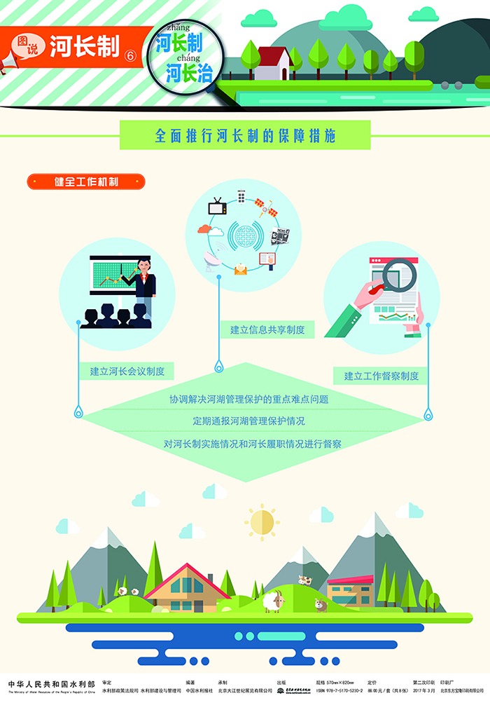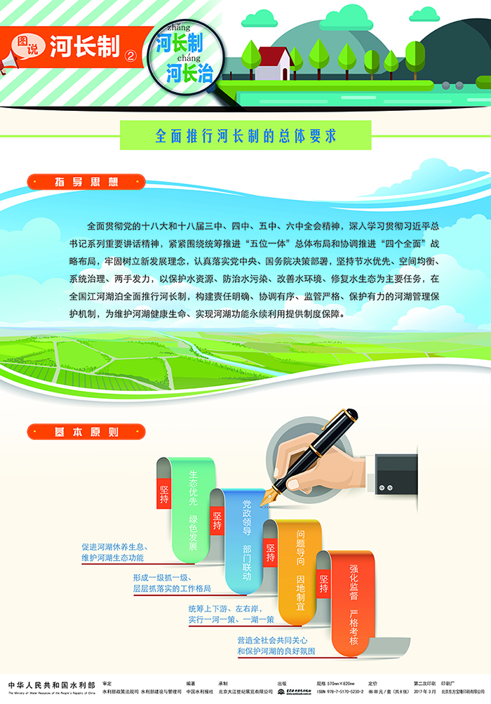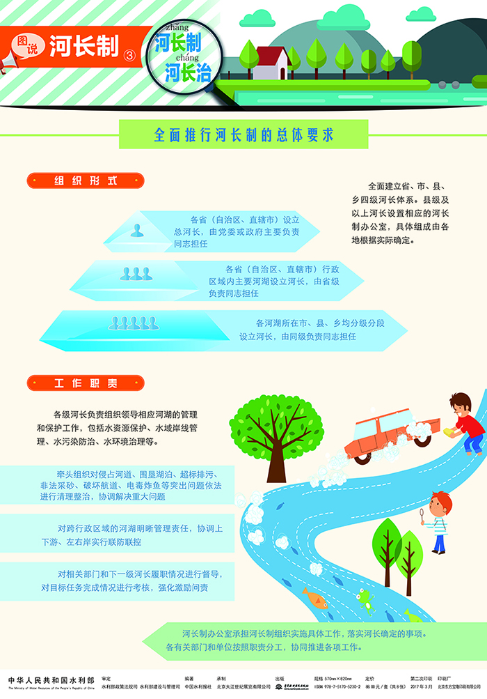“河長制”,即由中國各級黨政主要負責人擔任“河長”,負責組織領導相應河湖的管理和保護工作。“河長制”工作的主要任務包括六個方面:一是加強水資源保護,全面落實最嚴格水資源管理制度,嚴守“三條紅線”;二是加強河湖水域岸線管理保護,嚴格水域、岸線等水生態(tài)空間管控,嚴禁侵占河道、圍墾湖泊;三是加強水污染防治,統(tǒng)籌水上、岸上污染治理,排查入河湖污染源,優(yōu)化入河排污口布局; 四是加強水環(huán)境治理,保障飲用水水源安全,加大黑臭水體治理力度,實現河湖環(huán)境整潔優(yōu)美、水清岸綠; 五是加強水生態(tài)修復,依法劃定河湖管理范圍,強化山水林田湖系統(tǒng)治理; 六是加強執(zhí)法監(jiān)管,嚴厲打擊涉河湖違法行為。