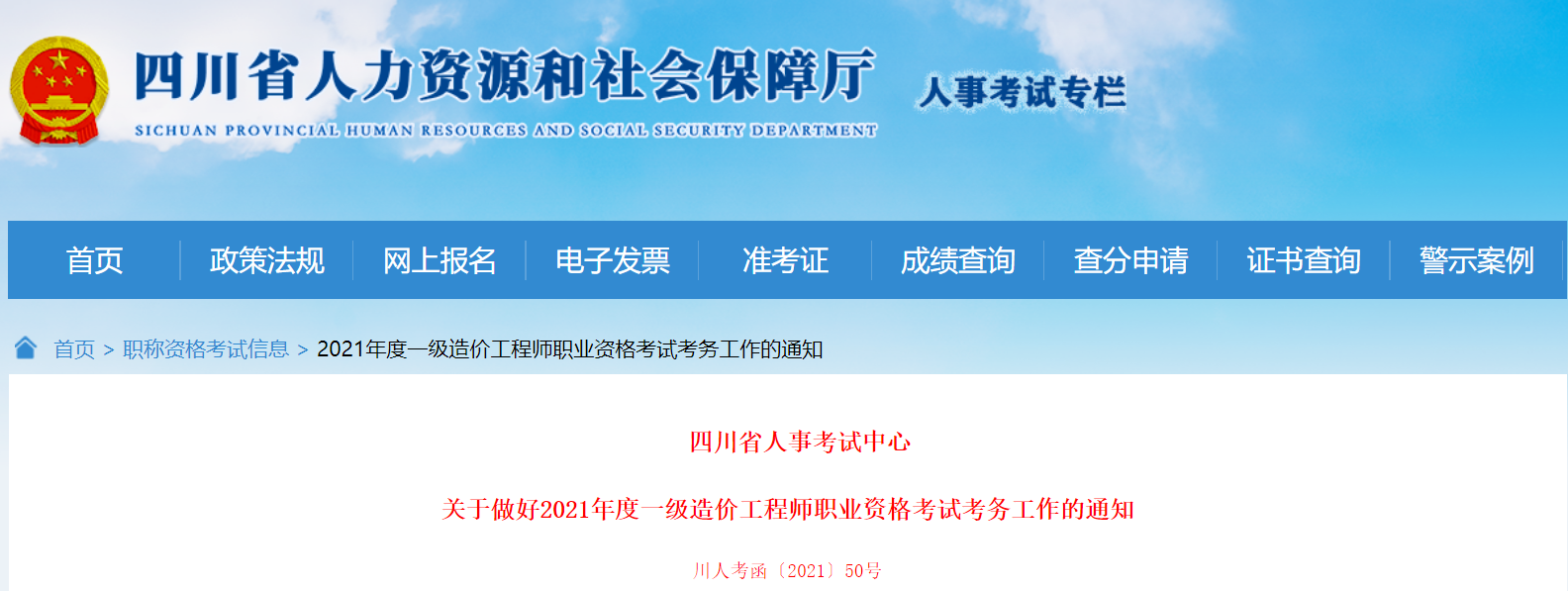 根據人力資源社會保障部人事考試中心《關于2021年度一級造價工程師職業資格考試考務工作的通知》(人考中心函〔2021〕34號)及四川省人力資源和社會保障廳《關于做好我省專業技術人員資格考試告知承諾制有關工作的通知》(川人社辦發〔2020〕14號)等文件精神,為切實做好我省2021年度一級造價工程師職業資格考試考務工作,現將有關事項通知如下:
